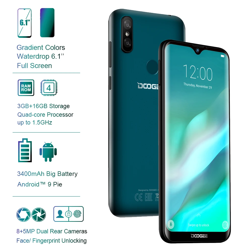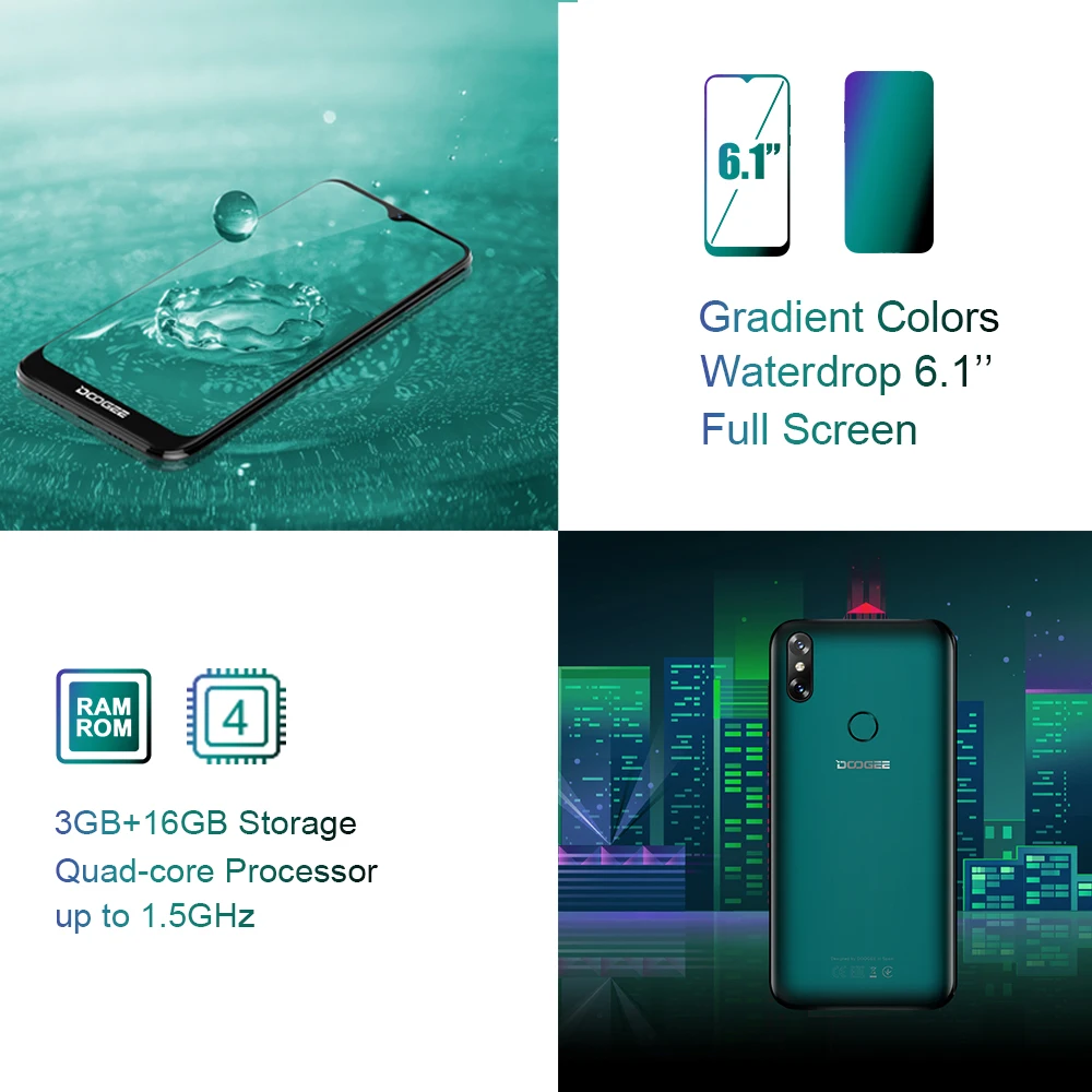 Product Name: DOOGEE Y8 Smartphone MTK6739 3GB RAM 16GB ROM Android 9.0 FDD LTE 6.1 pouces 199 Waterdrop LTPS écran 3400mAh double SIM 8.0MP Cam