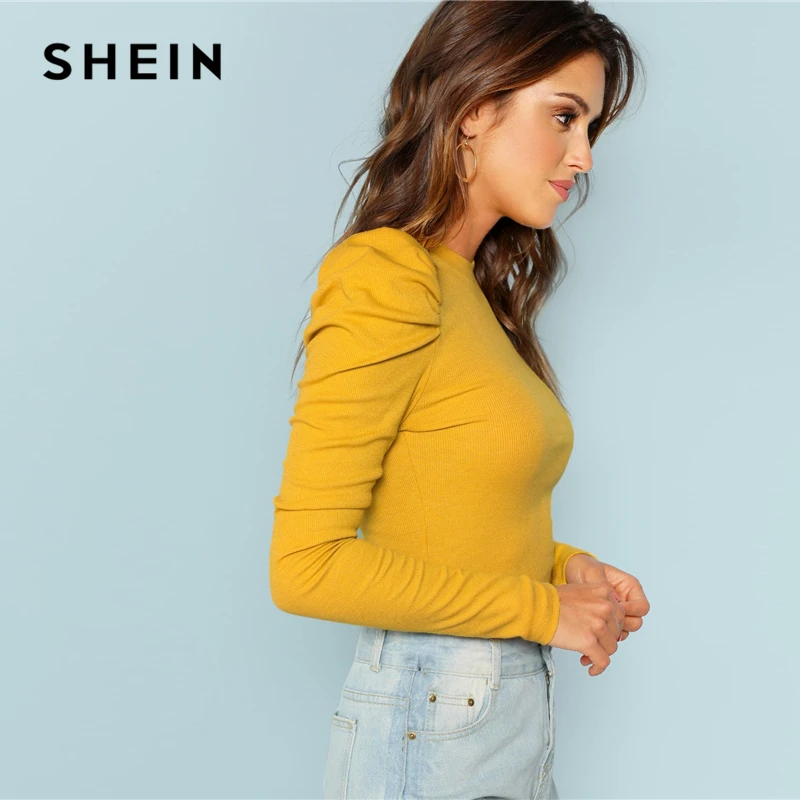 Special Offer SHEIN moutarde élégant minimaliste manches bouffantes côtes tricot solide pulls Slim Fit Tee 2018 automne bureau dame femmes T shirt haut Discount 40% Today!