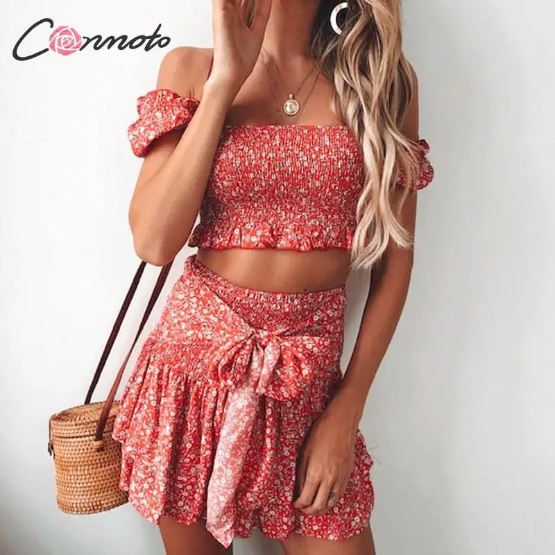 Special Offer Conmoto été 2019 Sexy 2 pièces robe femmes torsion hors épaule plage robes féminines bohème décontracté à volants robe portefeuille Vestido Discount 42% Today!