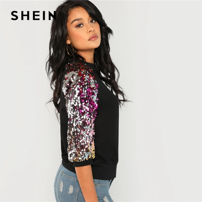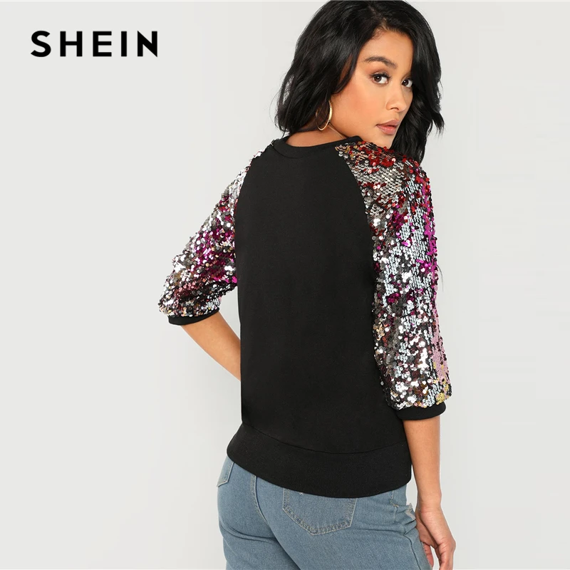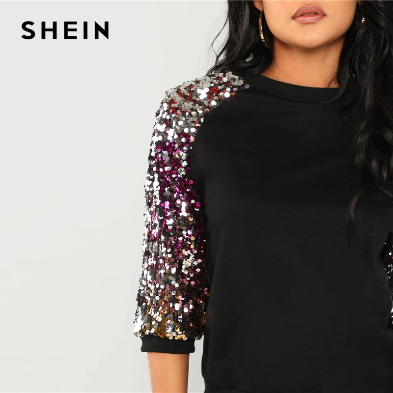 Special Offer SHEIN noir Highstreet Sequin Colorblock 3 4 longueur Raglan manches Streetwear sweat 2018 automne décontracté femmes Sweatshirts Discount 40% Today!