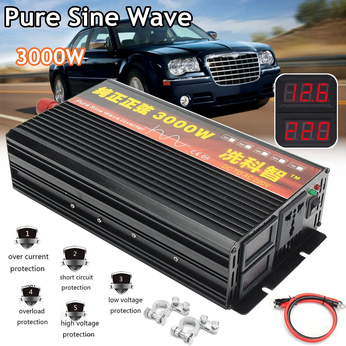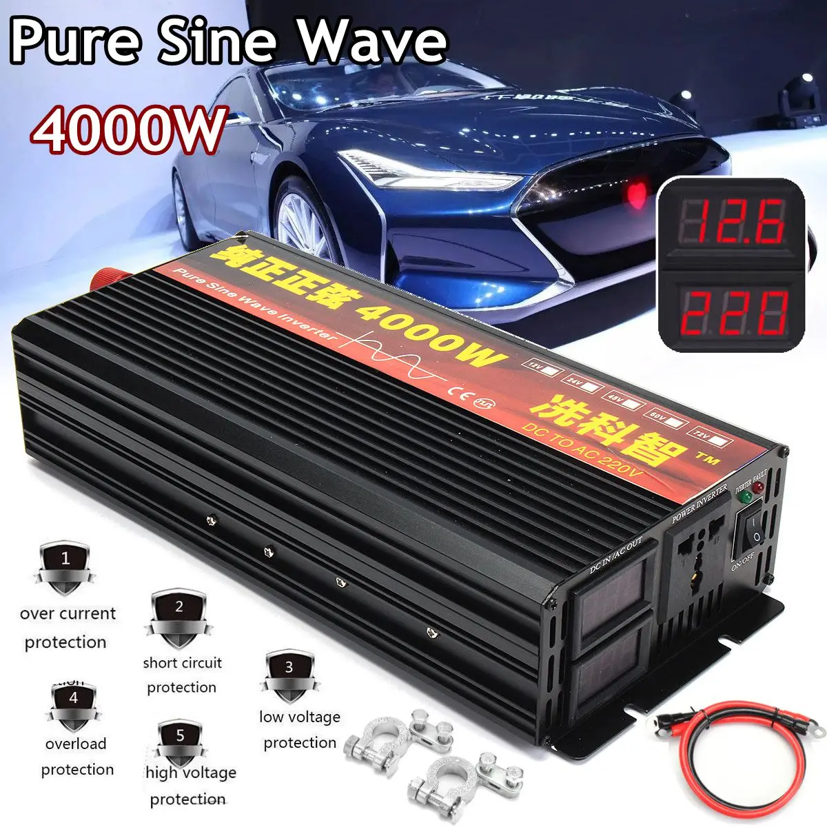 Product Name: Onduleur 12 V 24 V 220V 2000 3000 4000W transformateur de tension onduleur à onde sinusoïdale Pure DC12V à convertisseur ca 220V + affichage 2 LED